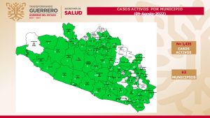 Chilpancingo, Gro., 09 de agosto 2022.- La Secretaría de Salud informó que el estado de Guerrero ocupa el lugar 22 a nivel nacional con 1,435 casos activos de Covid-19, confirmando 30 nuevos casos y 3 defunciones en las últimas 24 horas, de acuerdo con el reporte técnico que emite diariamente, con una ocupación de camas Covid del 18 por ciento.