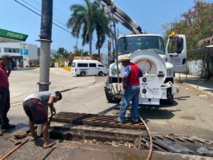 Acapulco, Gro. 24 de junio 2023. La Comisión de Agua Potable, Alcantarillado y Saneamiento del Estado de Guerrero (CAPASEG) realizó el desazolve urgente de taponamientos del sistema de alcantarillado y drenaje ocasionados por las primeras lluvias en el Bulevar de las Naciones y Avenida de Las Palmas, del puerto de Acapulco.