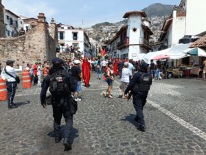 En Taxco de Alarcón, elementos de la Policía Estatal mantienen este viernes acciones de seguridad y vigilancia durante el desarrollo de la “Procesión de las Tres Caídas”.