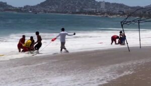 Acapulco, Gro., 10 de abril de 2025.- La tarde de este jueves, los guardavidas Sai Valente Díaz, Alejandro Martínez, Omar Romero y Pedro Valle, junto con prestadores de servicios turísticos, realizaron con éxito en playa El Morro el rescate de dos jóvenes, de 24 y 25 años de edad, originarias de la Ciudad de México.