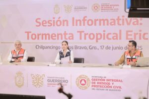 Dijo que Guerrero está listo para enfrentar cualquier eventualidad con responsabilidad, unidad y coordinación, priorizando la protección de los guerrerenses, afirmó la gobernadora acompañada por el secretario de Gestión Integral de Riesgos y Protección Civil, Roberto Arroyo Matus y en meteorólogo, Fermín Damián Adame.
