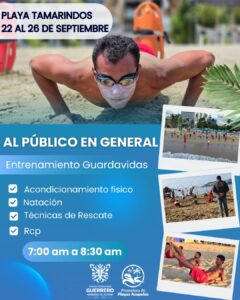 Acapulco, Gro., 18 de septiembre de 2025.- La Promotora de Playas de Acapulco invita a la población a sumarse a los entrenamientos con guardavidas en la playa Tamarindos del 22 al 26 de septiembre.