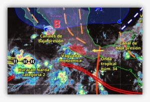 Lo anterior se debe a un Canal de Baja Presión que se extiende al norte del estado, asociada con la Vaguada Monzónica que se encuentra muy cerca de la costa de Guerrero, favoreciendo el impulso de Aire Marítimo Tropical procedente del Océano Pacífico, además del paso de la Onda Tropical Número 34, que podría comenzar a afectar al territorio guerrerense en las próximas horas.