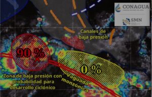 Además, también se observa otra zona de baja presión con 50% de probabilidad de desarrollo ciclónico en siete días, ubicada cerca de las costas de Chiapas, Oaxaca y Guerrero, la cual podría generar efectos en la entidad a mediados o finales de la próxima semana.