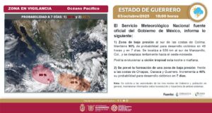 Chilpancingo, Gro., 03 de octubre de 2025.- El gobierno del estado a través de la Secretaría de Gestión Integral de Riesgos y Protección Civil mantiene en vigilancia una Zona de Baja Presión, la cual se ubica al sur de las costas de Colima con un 90 por ciento de probabilidad para desarrollo ciclónico en 48 horas y en 7 días.