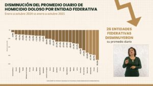 Chilpancingo, Gro., 11 de noviembre de 2025.- De acuerdo con el informe del Secretariado Ejecutivo del Sistema Nacional de Seguridad Pública, Guerrero registró una disminución del 23.2% en el promedio diario de homicidios dolosos entre enero y octubre de 2025, en comparación con el mismo periodo del año anterior.
