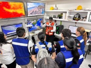 Durante un recorrido por las instalaciones de la Secretaría de Gestión Integral de Riesgos y Protección Civil Guerrero, en la ciudad de Chilpancingo, los jóvenes estudiantes que participan en un intercambio académico con la Universidad Autónoma de Guerrero, conocieron el área de monitoreo, el Sistema de Alertamiento Meteorológico y el Atlas Estatal de Riesgos.