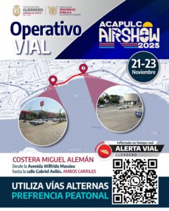 Acapulco, Guerrero, 20 de noviembre de 2025.- El Gobierno de Guerrero, a través de la Secretaría de Seguridad Pública Estatal, tiene listo el despliegue operativo especial para el desarrollo del Air Show 2025, que se desarrollará a partir de este 21 al 23 de noviembre en el puerto de Acapulco.