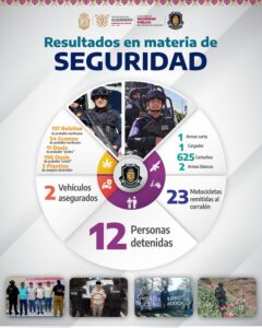 Mediante la presencia permanente, los patrullajes preventivos y las acciones de proximidad, se logró la detención de 12 personas, además del aseguramiento de vehículos, motocicletas remitidas al corralón, armas, cartuchos, diversas dosis de enervantes y la destrucción de plantíos.