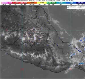 Chilpancingo, Gro., 27 de diciembre de 2025.- La Secretaría de Gestión Integral de Riesgos y Protección Civil pronostica para este sábado un día parcialmente nublado y caluroso, con la probabilidad de lluvias ligeras y el descenso de los valores de las temperaturas al final de la tarde y durante noche en gran parte del estado.