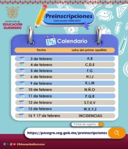 Chilpancingo, Gro., 14 de enero de 2026. La Secretaría de Educación Guerrero (SEG) emitió la circular para el proceso de preinscripciones para educación básica, que se llevará a cabo del 3 al 13 de febrero.