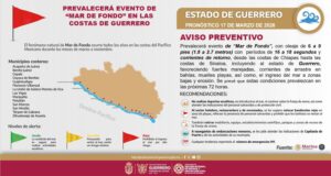 Chilpancingo, Gro., 17 de marzo de 2026.- La Secretaría de Gestión Integral de Riesgos y Protección Civil informó que se prevé la presencia de un evento de “Mar de Fondo” en las costas del Pacífico, desde Chiapas hasta Sinaloa, incluyendo Guerrero.