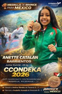 La guerrerense Anette Catalán obtuvo la medalla de bronce en el Campeonato Centroamericano de Karate CCONDEKA 2026, realizado en Managua, Nicaragua, tras una destacada participación frente a competidoras de distintos países de la región.