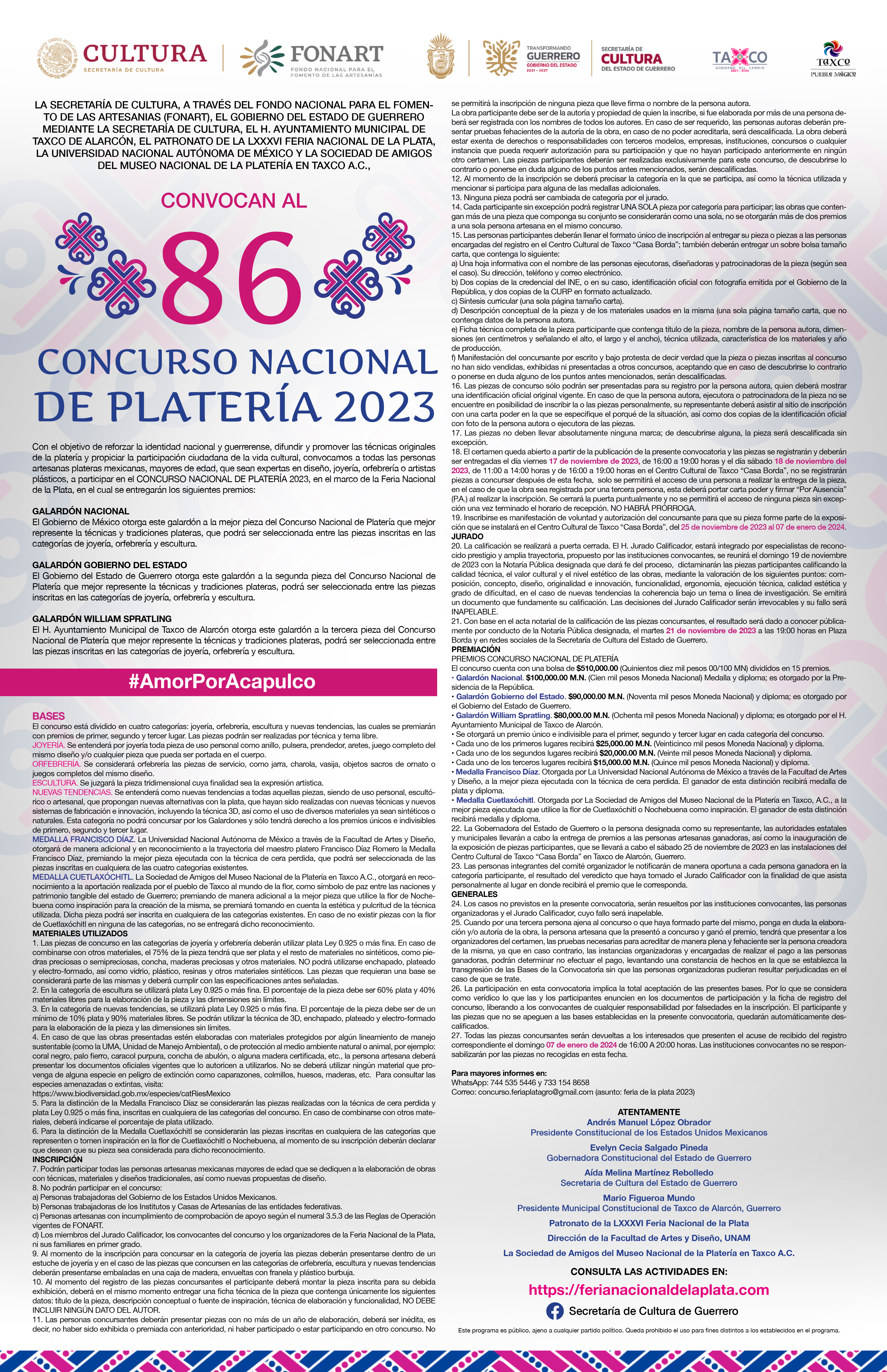 La Secretaría de Cultura, a través del Fondo Nacional para el Fomento de las Artesanías (FONART), el Gobierno del estado de Guerrero mediante la Secretaría de Cultura, el H. Ayuntamiento municipal de Taxco de Alarcón, el Patronato de la LXXXVI Feria Nacional de la Plata, la Universidad Nacional Autónoma de México y la Sociedad de Amigos del Museo Nacional de la Platería en Taxco A.C., convocan al 86 Concurso Nacional de Platería 2023.