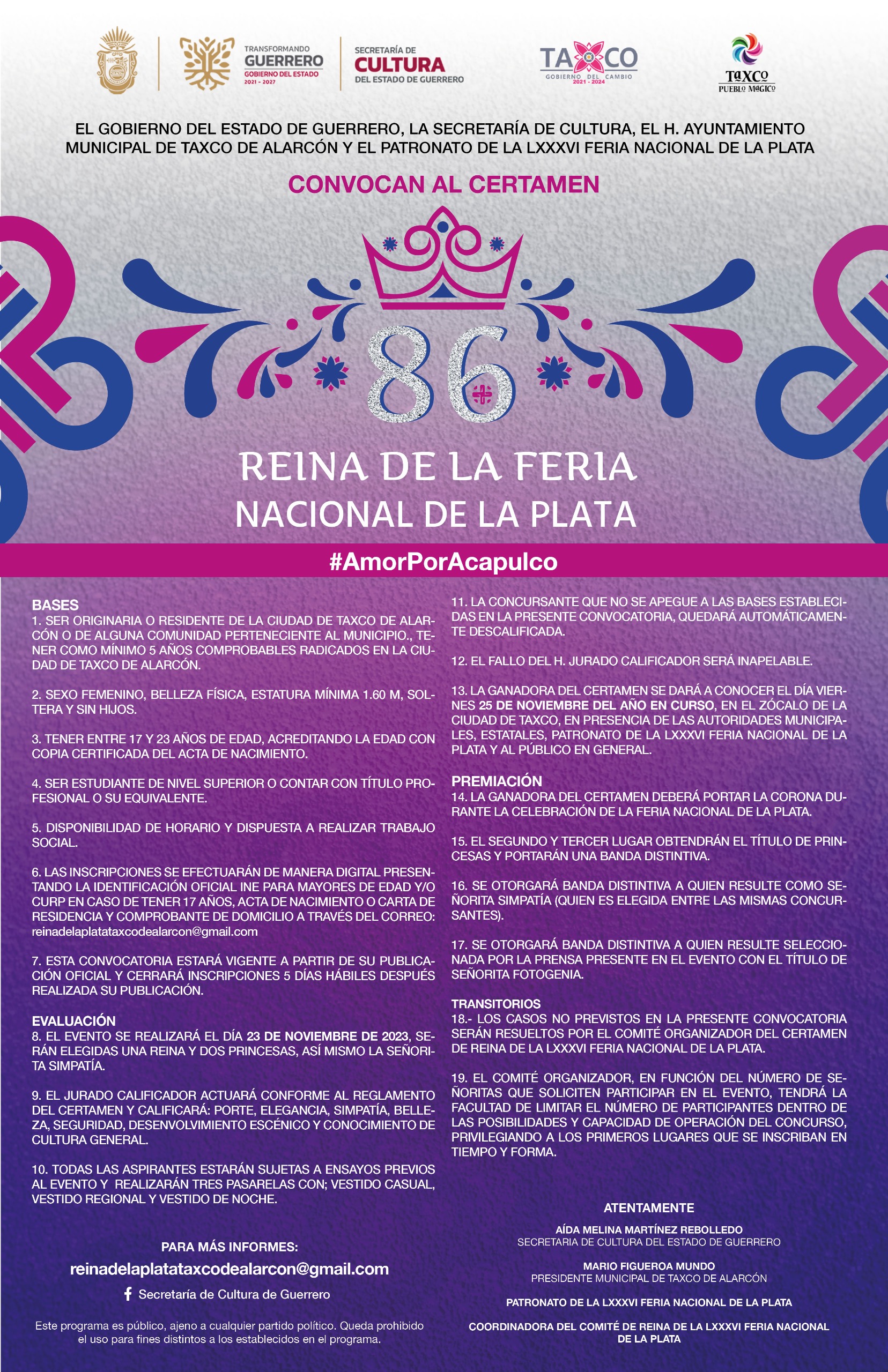 El Gobierno de Guerrero, la Secretaría de Cultura, el H. Ayuntamiento municipal de Taxco de Alarcón y el Patronato de la LXXXVI Feria Nacional de la Plata, convocan al certamen 86 Reina de la Feria Nacional de la Plata.
