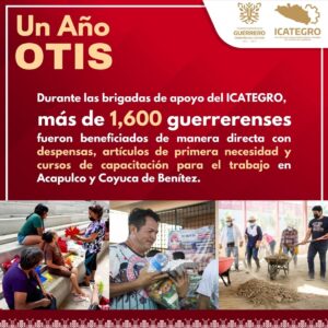 A un año del paso del huracán Otis por nuestro Estado, el Gobierno de Evelyn Salgado Pineda, a través de las brigadas del ICATEGRO atendieron de manera integral a más de 1,600 habitantes de Acapulco y Coyuca de Benítez.