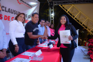 El Director General del ICATEGRO, Lic. Omar Estrada Bustos, la Presidenta Municipal de Eduardo Neri, Q.B.P. Sara Salinas Bravo, y el Senador Félix Salgado Macedonio, hicieron entrega de constancias a las alumnas egresadas de los cursos “Aplicación y Decoración de Uñas Esculturales Módulo II” y “Maquillaje Básico”, que se impartieron en la cabecera municipal.