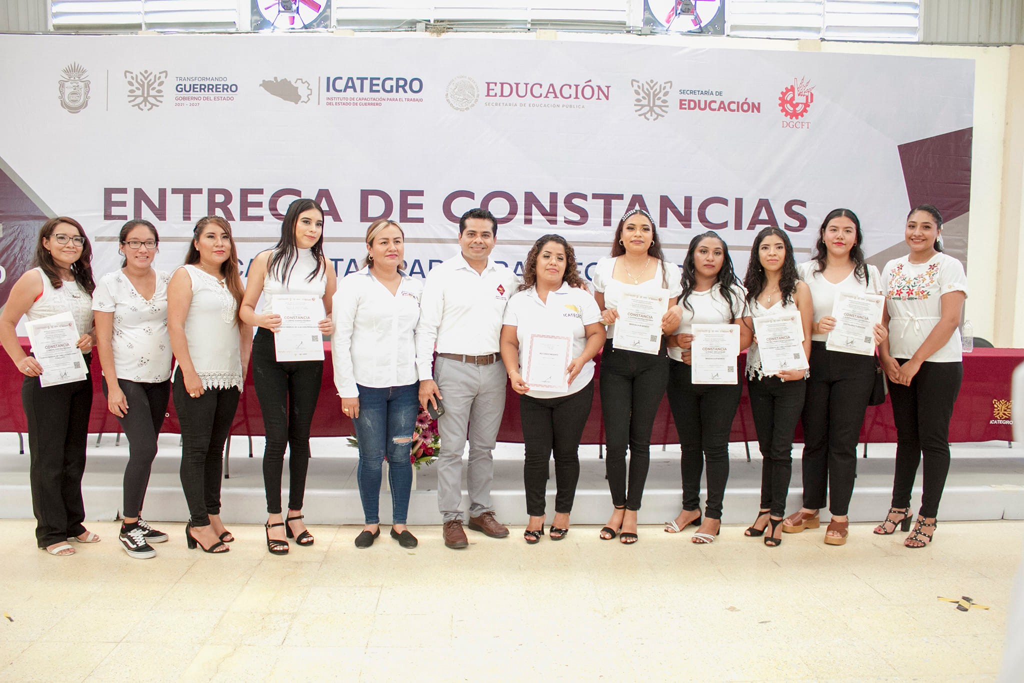 El Director General del ICATEGRO, Lic. Omar Estrada Bustos, junto al Cap. Rodolfo Jesús Martínez Menez, Delegado General de Gobierno Zona Norte y representante de la Gobernadora del Estado, Mtra. Evelyn Salgado Pineda y la Diputada Electa por el Distrito 22, Dra. Luissana Ramos Pineda; el día de hoy, llevaron a cabo la Entrega de Constancias a las y los alumnos que concluyeron satisfactoriamente los cursos de capacitación impartidos por la A.M. Iguala, dirigida por el Lic. Juan Pablo Domínguez Barrera, que en el período de enero – julio impartió 1,595 horas de capacitación, a través de 59 cursos, obteniendo una matrícula total de 1,439 participantes.Con estas acciones el ICATEGRO reafirma su compromiso de revertir el índice de desempleo a través del aprendizaje, ya que la capacitación es un elemento fundamental, que permite fortalecer y adquirir nuevos conocimientos para aumentar la competitividad y productividad, la incorporación al ámbito laboral o para generar ingresos mediante el autoempleo y mejorar la calidad de vida de las y los guerrerenses.