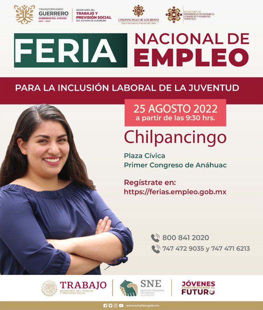 En el marco de la celebración por el Día Internacional de la Juventud, la Secretaría del Trabajo y Previsión Social, a traves del Servicio Nacional de Empleo en Guerrero, te invita a participar en la Feria de Empleo en Chilpancingo. Donde contará con la participación de al menos 20 empresas que estarán ofertando mas de 200 plazas de trabajo para todos los niveles educativos.