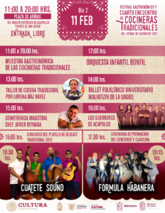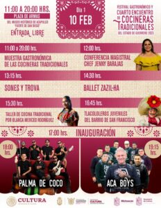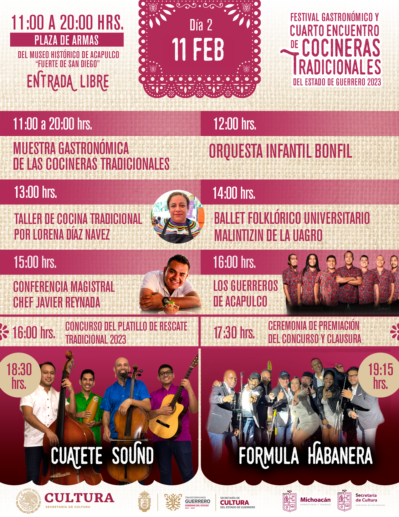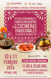 Con el objetivo de promover el patrimonio cultural gastronómico de las regiones de nuestro estado, el Gobierno de Guerrero que encabeza Evelyn Cecia Salgado Pineda, a través de la Secretaría de Cultura, anuncian la realización del “Festival Gastronómico y Cuarto Encuentro de Cocineras Tradicionales del Estado de Guerrero 2023”, que se llevará a cabo los días 10 y 11 de febrero en el Museo Histórico de Acapulco “Fuerte de San Diego”, dicho festival contará con la participación de 24 Cocineras Tradicionales de las regiones Norte, Acapulco, Centro, Costa Chica, Costa Grande, Tierra Caliente, Montaña de la entidad y Michoacán como estado invitado.