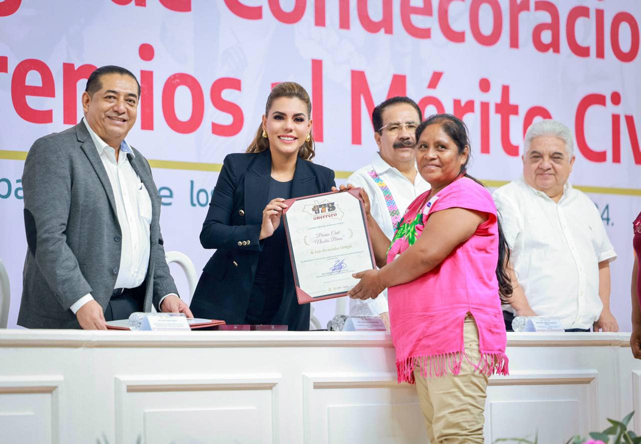 En el Auditorio José Joaquín de Herrera en Chilpancingo, la mandataria estatal otorgó tres condecoraciones estatales y 12 premios al Mérito Civil, a un total de 15 guerrerenses por su espíritu solidario, su trabajo excepcional y destacada contribución para el progreso, desarrollo y bienestar de Guerrero.