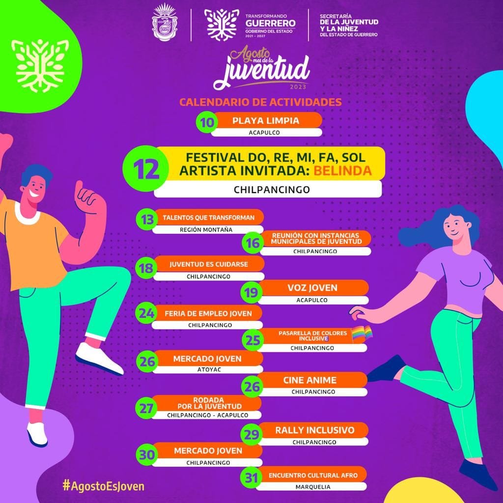 Chilpancingo, Gro., 12 de agosto del 2023.-Con el propósito de fomentar la convivencia y motivar a las y los jóvenes para que muestren sus talentos, disfruten de conciertos, conozcan ofertas laborales y se involucren en la vida pública de Guerrero, la #SEJUVE presentó la programación de eventos que han sido organizados para celebrar el Mes de la Juventud.