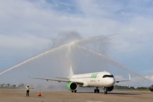 A su llegada al puerto, el avión Airbus A320 recibió el tradicional bautizo al cruzar por un arco de agua.
