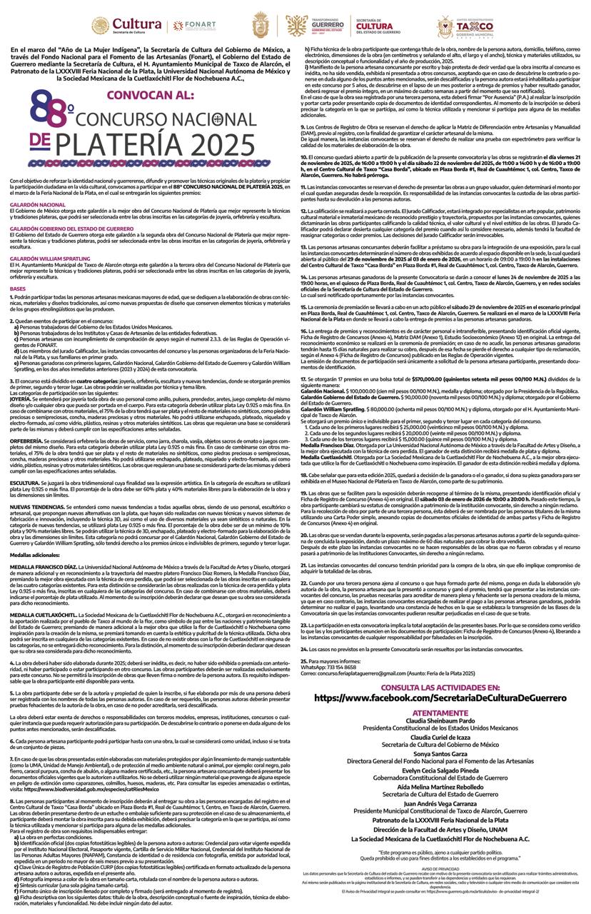 Con el objetivo de reforzar la identidad nacional y guerrerense, difundir y promover las técnicas originales de la platería y propiciar la participación ciudadana en la vida cultural, convocamos a participar en el 88° CONCURSO NACIONAL DE PLATERÍA 2025, en el marco de la Feria Nacional de la Plata, en el cual se entregarán los siguientes premios: