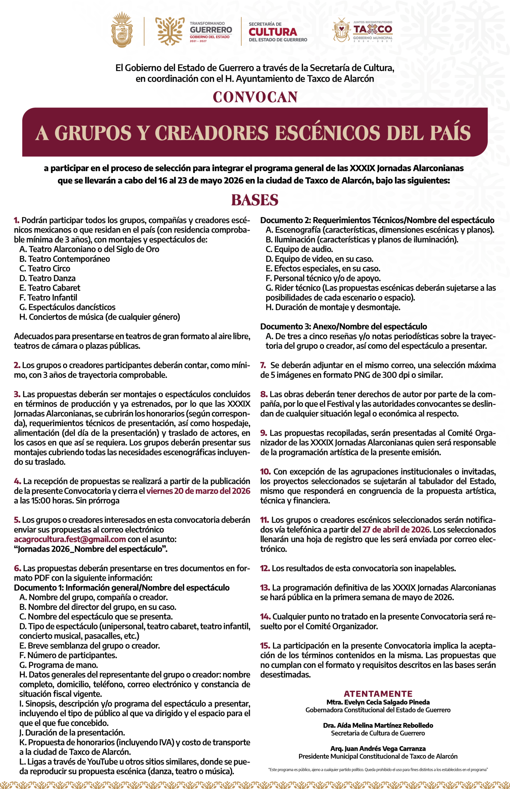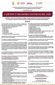 El Gobierno del Estado de Guerrero a través de la Secretaría de Cultura en coordinación con el H. Ayuntamiento de Taxco de Alarcón, convocan a Grupos y Creadores Escénicos del País, a participar en el proceso de selección para integrar el programa general de las XXXIX Jornadas Alarconianas