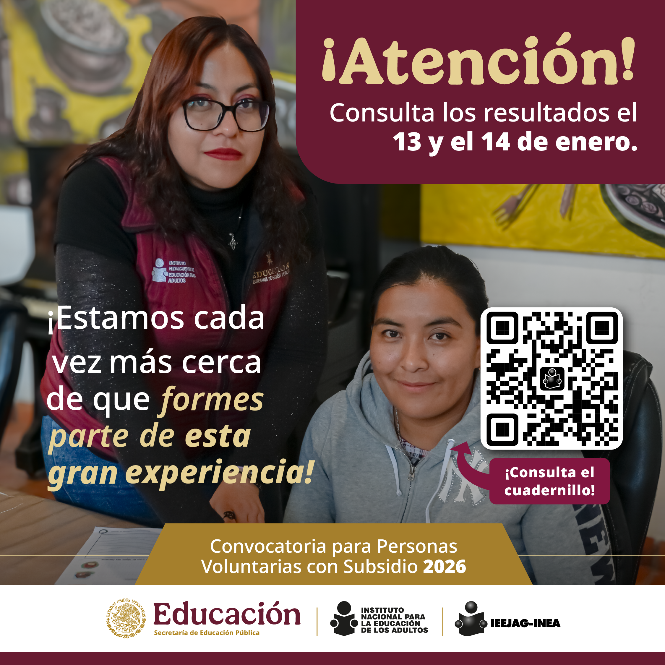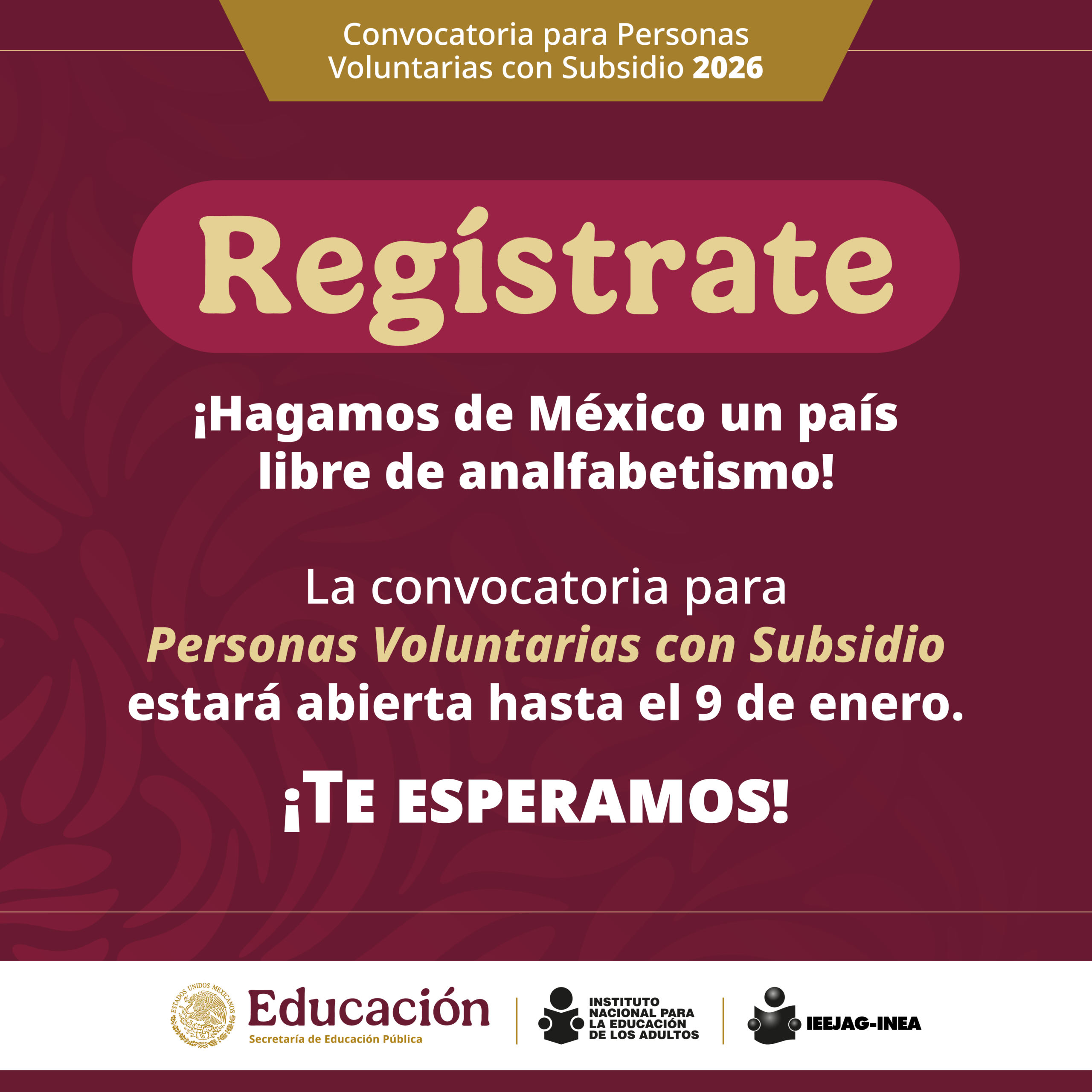 El Instituto Nacional para la Educación de los Adultos (INEA) y el Instituto Estatal para la Educación de Jóvenes y Adultos de Guerrero convocan a toda persona física que desee participar como Persona Voluntaria con Subsidio (PVS), a efecto de apoyar el Programa Educación para Adultos que ofrece alfabetización, primaria y secundaria para personas de 15 años o más, en situación de rezago educativo.