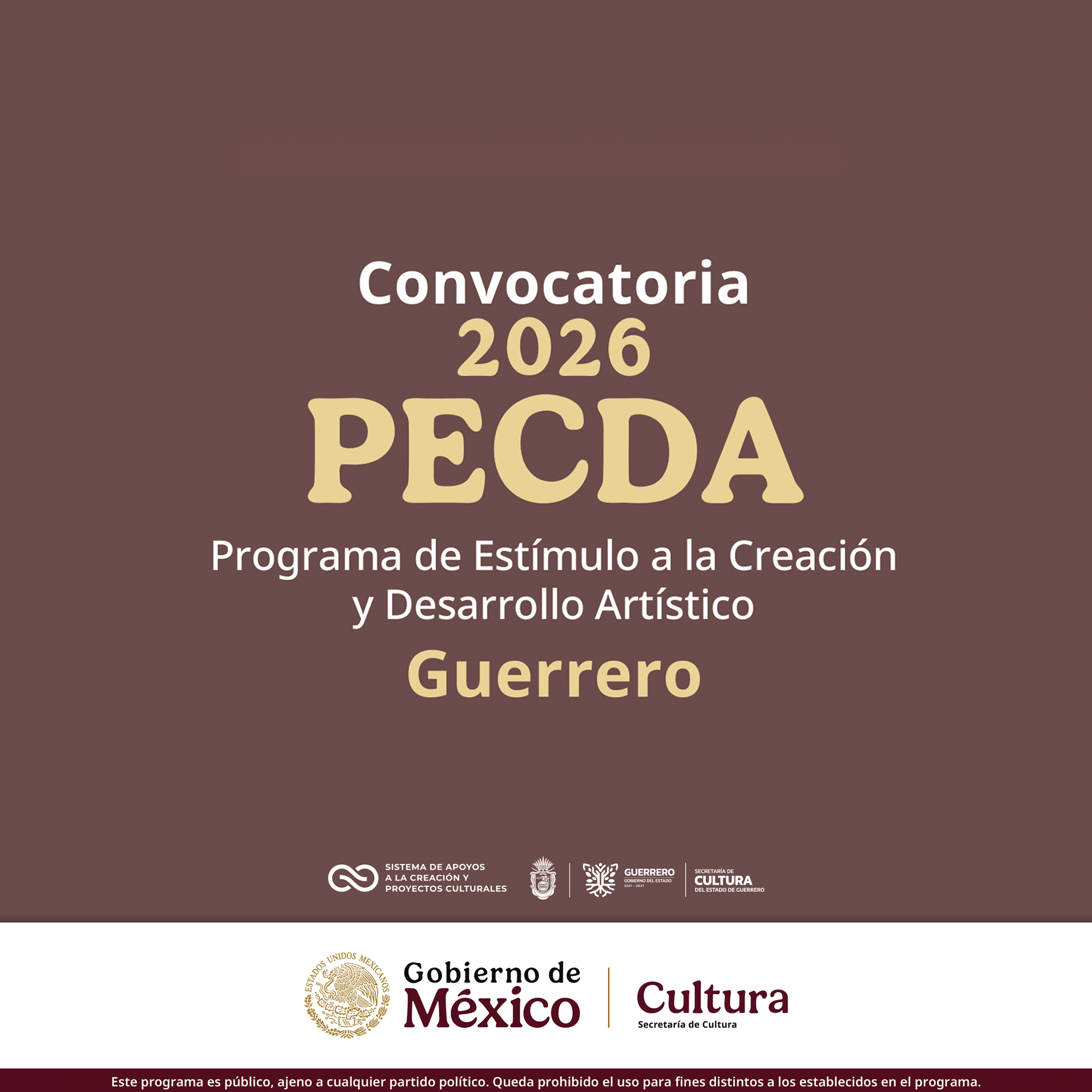La Secretaría de Cultura del Gobierno de México, a través de la Dirección General del Sistema de Apoyos a la Creación y Proyectos Culturales (SACPC) en coordinación con el Gobierno del estado de Guerrero, a través de su Secretaría de Cultura convocan a la comunidad artística a participar en la emisión 2026 del Programa de Estímulo a la Creación y Desarrollo Artístico (PECDA) Guerrero.