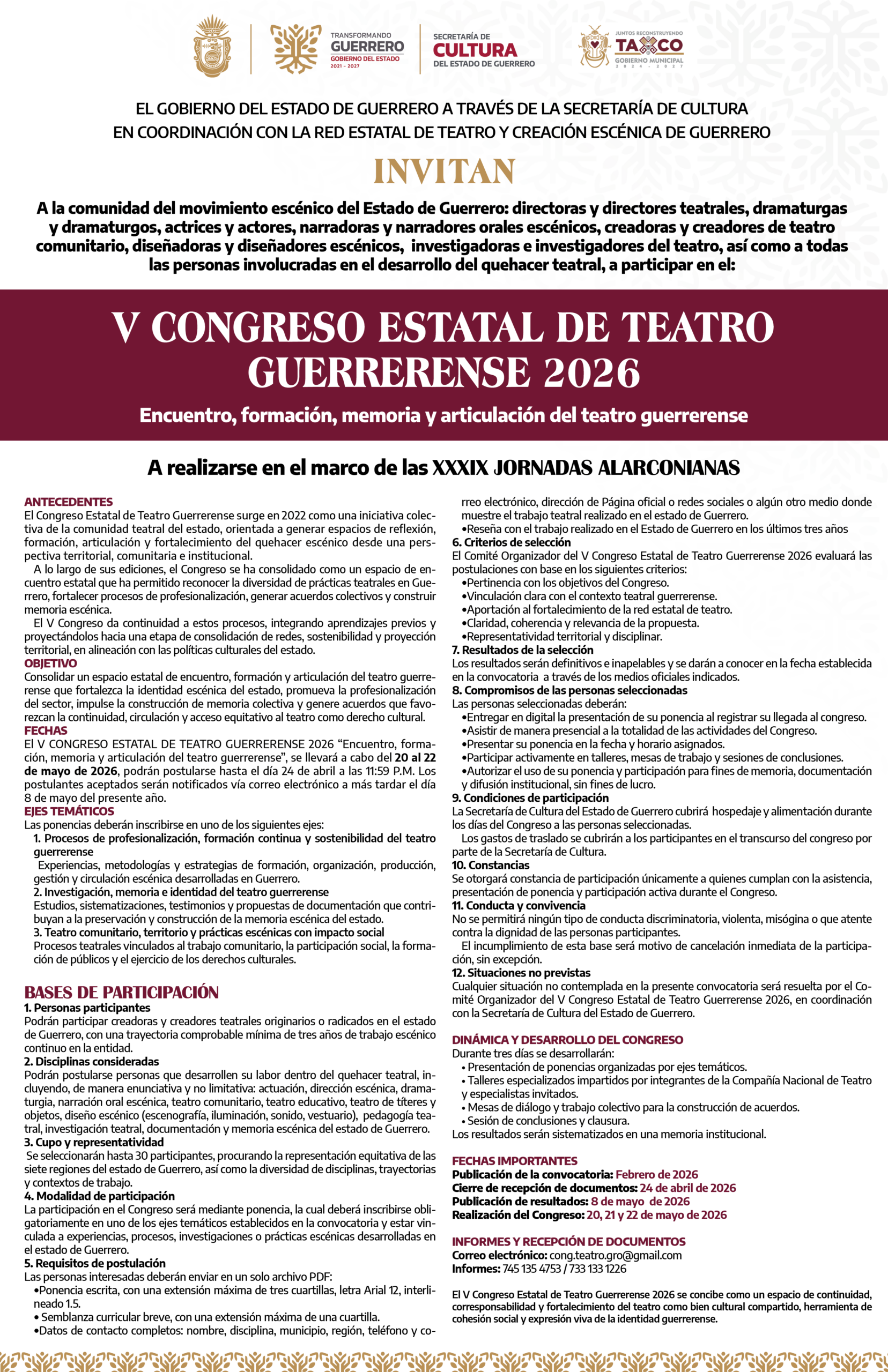Mayor información y recepción de documentos al correo electrónico: cong.teatro.gro@gmail.com o a los teléfonos: 745 135 4753 / 733 133 1226.