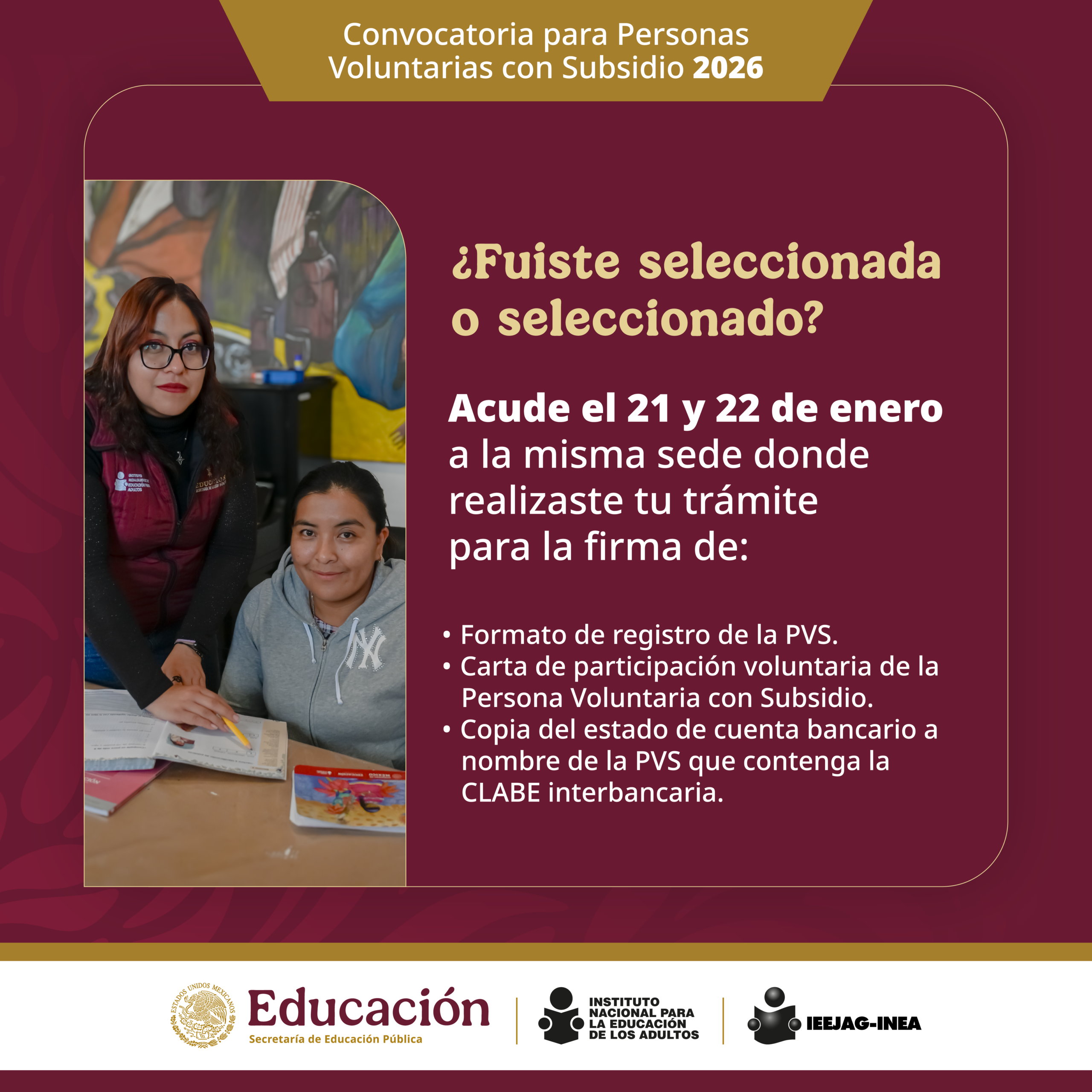 Las personas aspirantes a PVS, cuyo número de Folio aparecen en esta publicación, aprobaron el examen y fueron seleccionados, deberán acudir personalmente al mismo lugar donde entregaron su documentación para continuar su registro y vinculación.