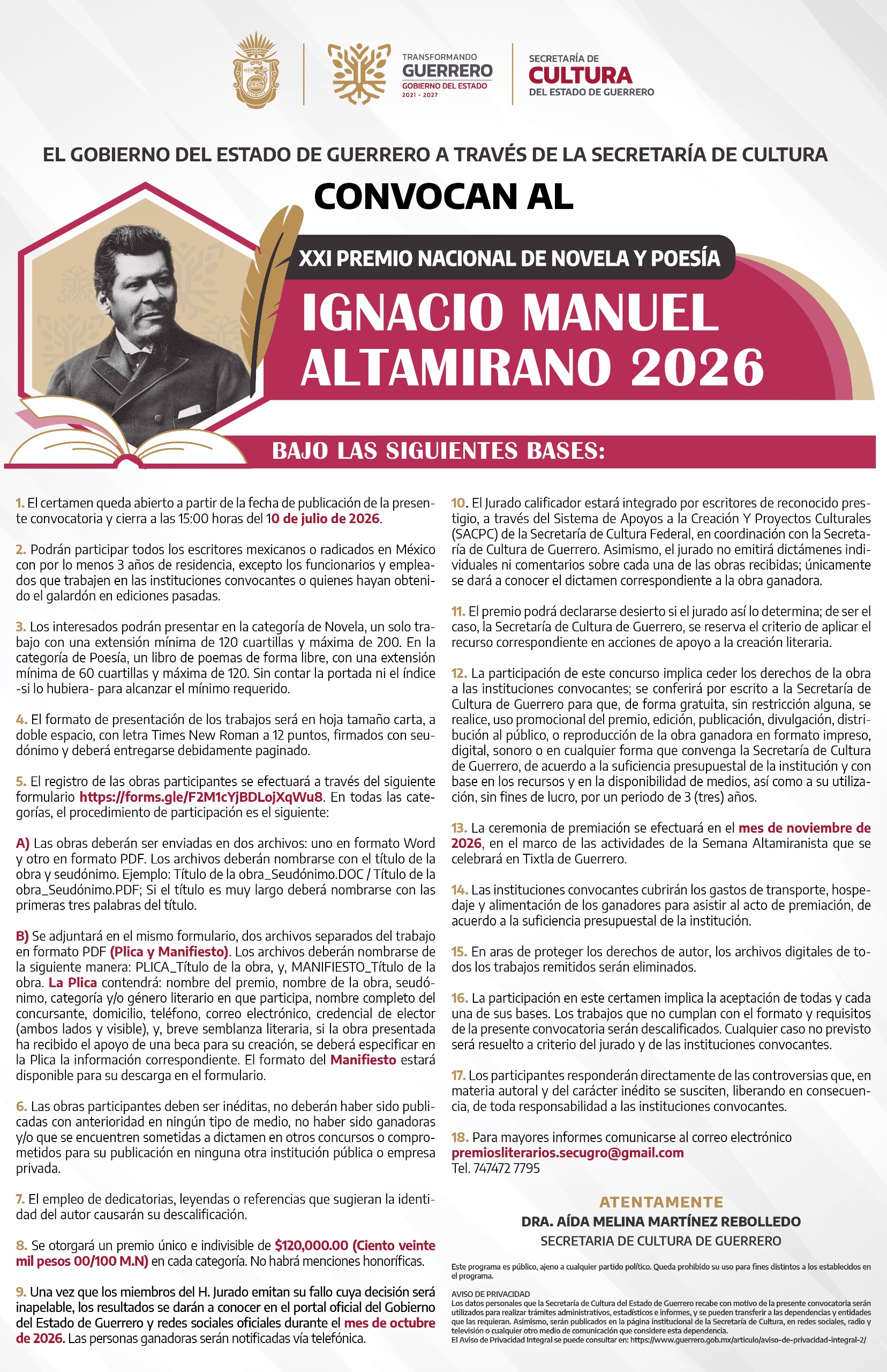 XXI Premio Nacional de Novela y Poesía “Ignacio Manuel Altamirano” 2026.